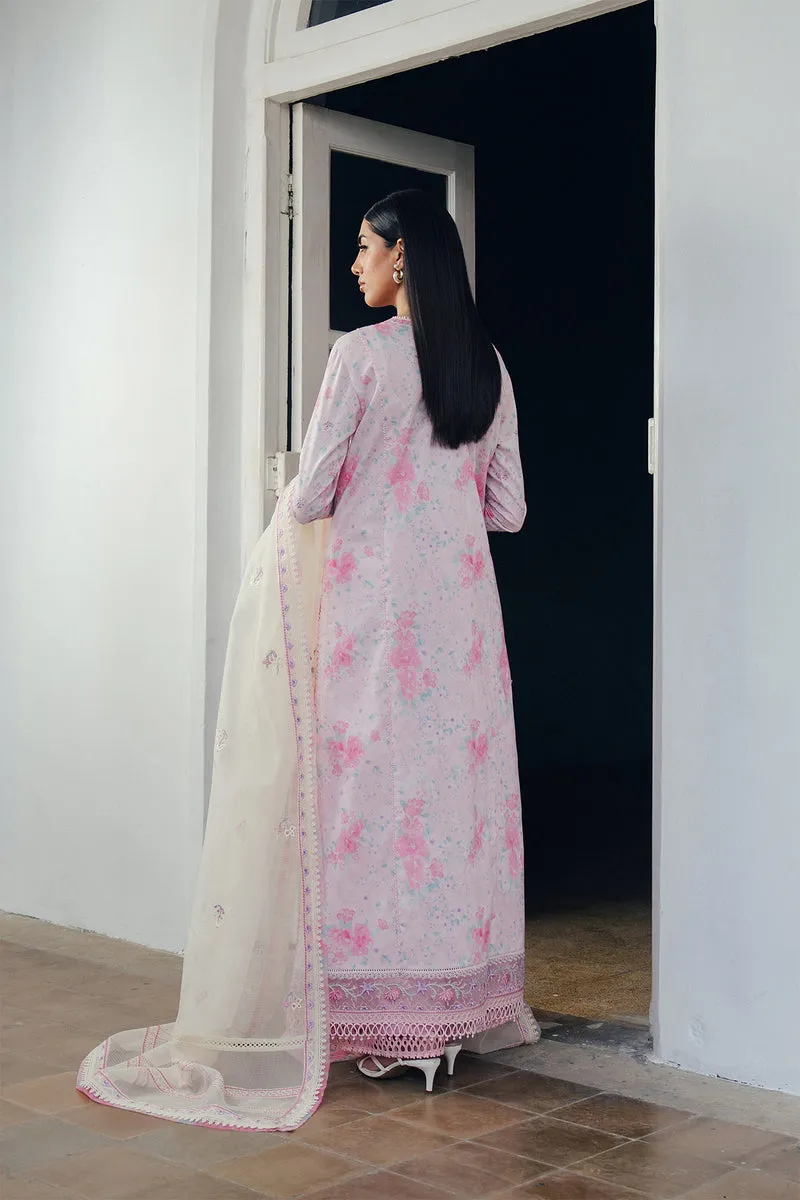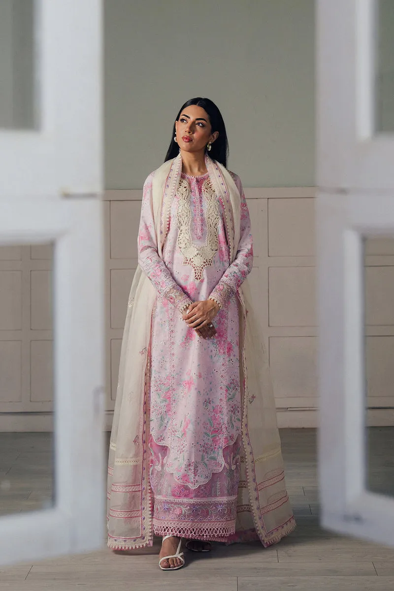 Blush-toned elegance comes alive through intricate detailing and delicate craftsmanship. A beautifully embroidered lawn front blooms with pastel florals and ornamental patterns, creating a silhouette that feels romantic and refined. The ensemble is complemented by subtle printed accents that add dimension, while the airy dupatta drapes effortlessly, enhanced with organza borders that introduce a structured, graceful finish. Paired with comfortable cotton culottes, the look captures a perfect balance of freshness, femininity, and timeless sophistication.