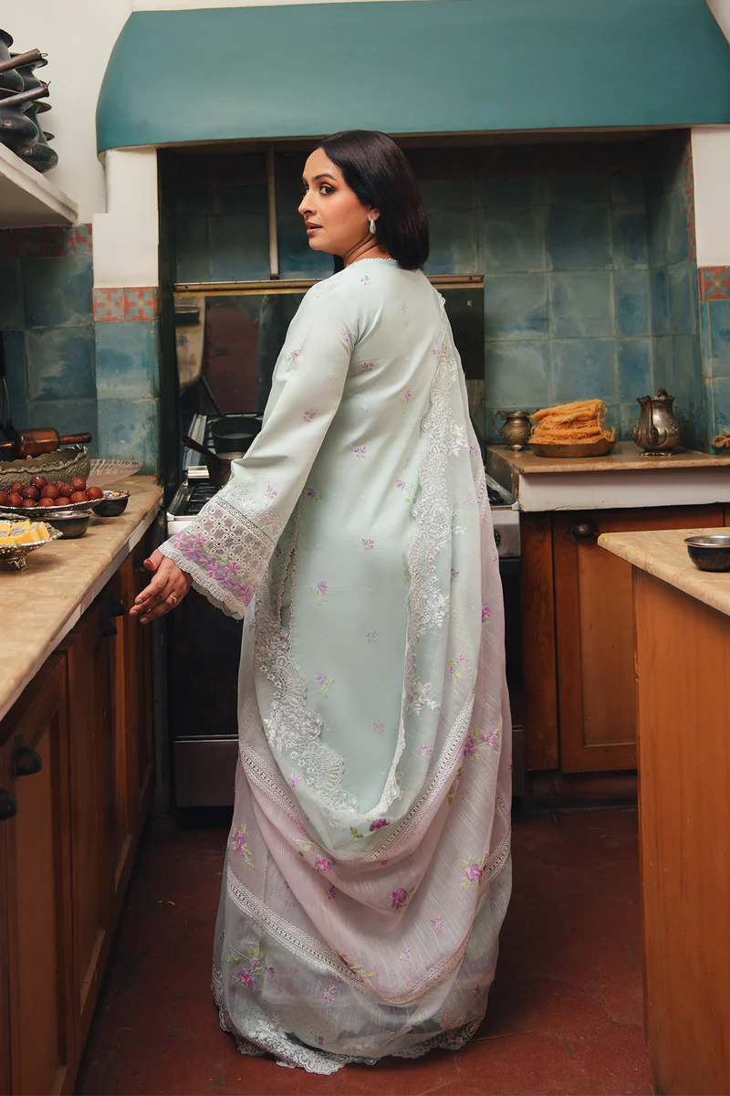 A soft mint ensemble that captures the warmth of Eid at home with effortless elegance. Crafted in a flowing, elongated silhouette, the shirt is delicately adorned with intricate pastel threadwork that weaves across the front in refined, symmetrical patterns. Fine lace panels and scalloped edging frame the hem and dupatta, adding texture and artisanal depth, while the airy sleeves enhance its graceful movement. Paired with tonal wide-leg trousers finished with subtle embroidered accents, the look feels balanced, polished, and beautifully put together. Perfect for hosting loved ones, sharing sweet moments in the kitchen, and embracing heartfelt family traditions — it’s a celebration of comfort, craft, and quiet luxury.