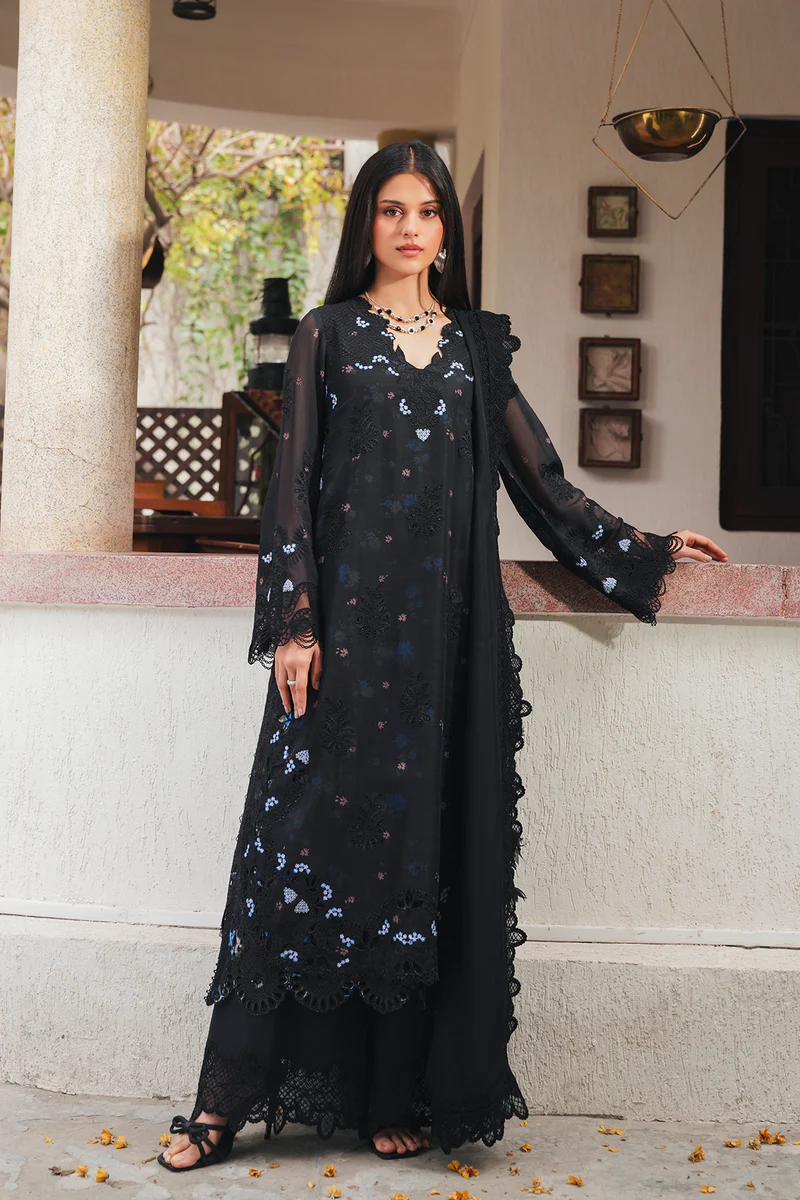 A modern ode to Eid elegance, this midnight-black ensemble captures the spirit of celebration with refined edge. The elongated silhouette is adorned with delicate tonal embroidery and subtle floral accents that shimmer softly under festive lights, while sheer statement sleeves introduce a contemporary touch of drama. Finished with intricate lace detailing along the hem and a flowing dupatta that drapes effortlessly at the side, the look feels both graceful and current. Paired with fluid wide-leg trousers, it strikes the perfect balance between tradition and modern sophistication — sleek, elevated, and made for an unforgettable Eid evening.
