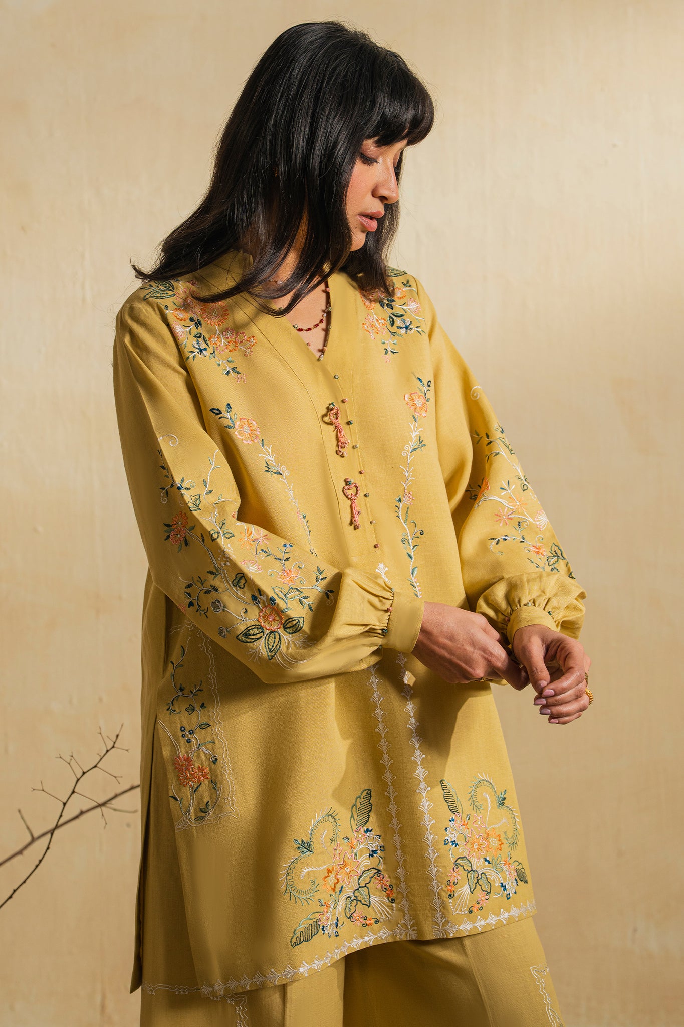Delicate multicolored floral embroidery trails softly along the neckline, sleeves, and hem, lending an artisanal charm that feels light and intentional. Subtle detailing across the kurta and trousers creates a graceful flow, balancing softness with structure.