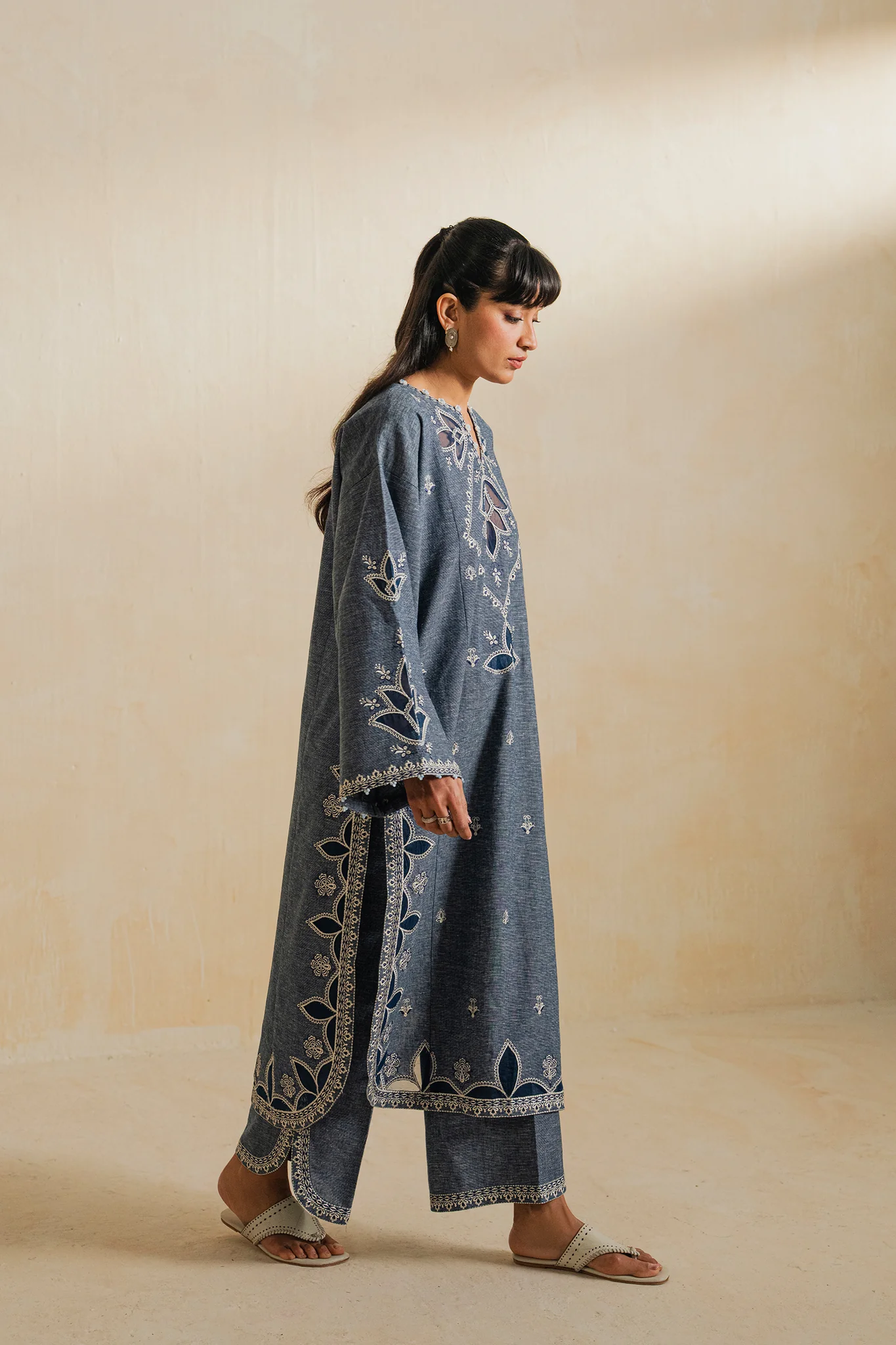 Rendered in a cool steel-blue yarn-dyed slub, Sahar carries a quiet strength. Delicate ivory threadwork forms geometric florals across the front and sleeves, bordered by intricate detailing that frames the silhouette with subtle precision.