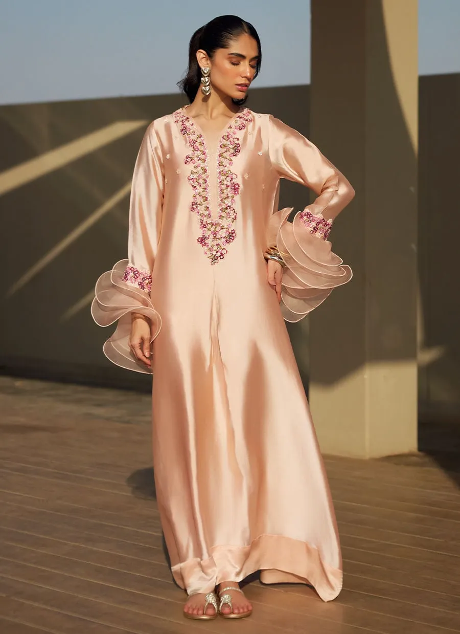 The Mariposa kaftam is a flowing floaty dream for you to indulge in. Utterly romantic and effortlessly elegant, this blush pink kaftan features a hand-embellished neckline, consisting of pearls, 3D flowers and Swarovski crystals that draws the eye with subtle sparkle. The flowing silhouette drapes gracefully, while statement sleeves are finished with delicate organza frills, adding movement and a touch of whimsical charm. Perfect for daytime celebrations or intimate evening gatherings, this kaftan is a sophisticated statement of effortless style.