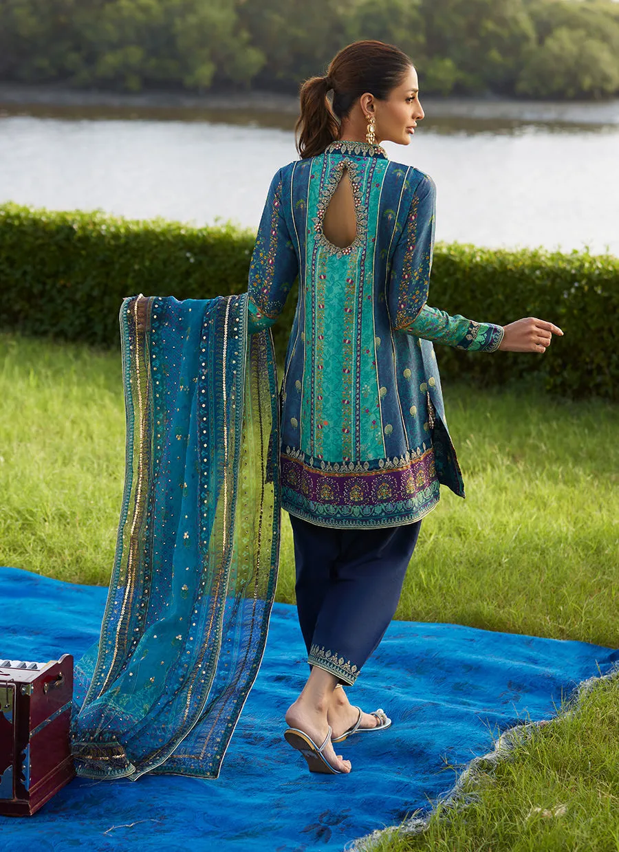 Turn up the glamour with this striking ink blue and teal ensemble — a seamless blend of tradition and contemporary allure. Cut from pure raw silk, the silhouette is designed to flatter effortlessly, featuring a thigh-skimming wrap top that cinches loosely at the waist for a beautifully feminine shape. Intricately hand-embellished with sequins, gota, and aari work, this piece radiates festive opulence. The tapered pure raw silk shalwar balances the drama with refined sophistication, making it an eternal favorite for every celebration.
