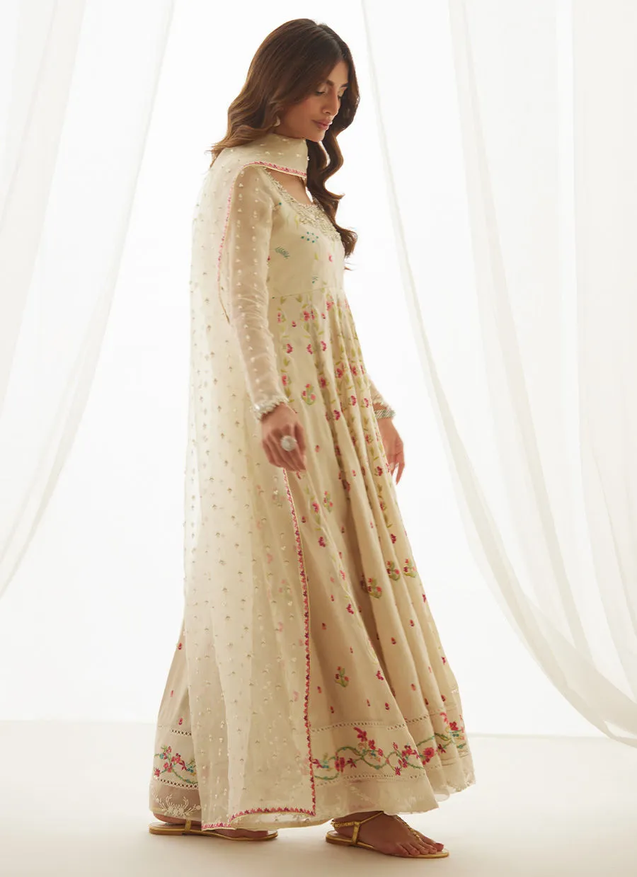 A soft play of textures defines this ivory raw silk kalidar, with embroidered organza sleeves and an intricately handworked, pearl-studded neckline. The hem carries an embroidered border for subtle structure, while a sheer organza dupatta with pearl and Swarovski crystal embellishments adds delicate sparkle. Paired with a raw silk izaar, the look is graceful, modern, and endlessly versatile.