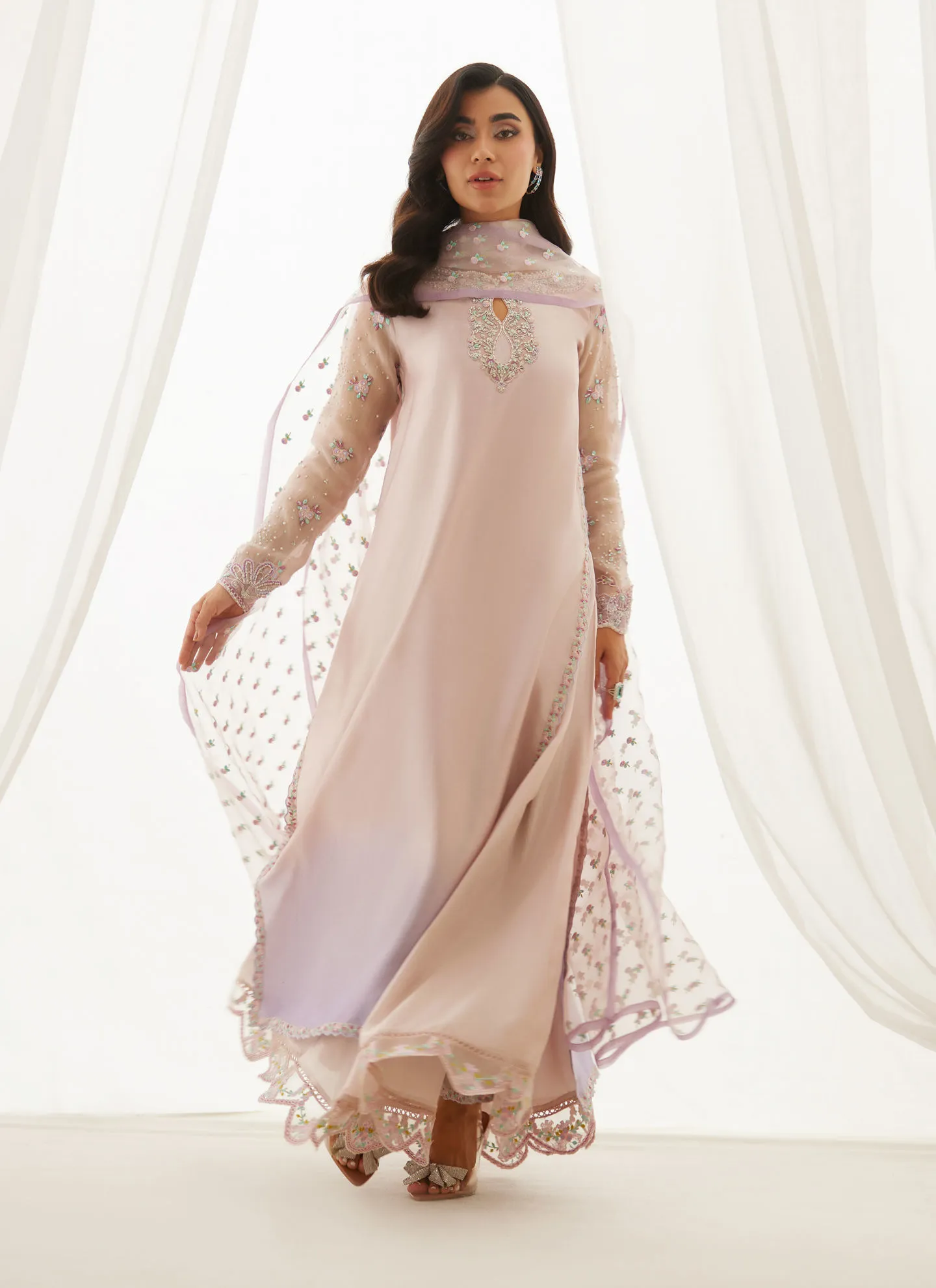 A vision in pale, silvery lavender that deepens into a rich tonal hue, adorned with composed silver and pearl embroidery. Delicate florals trace the neckline, while sleek organza sleeves shimmer with scattered sequins. Paired with an ethereal organza dupatta finished with intricate borders, this ensemble is eternally stylish, refined, and brimming with irresistible details.