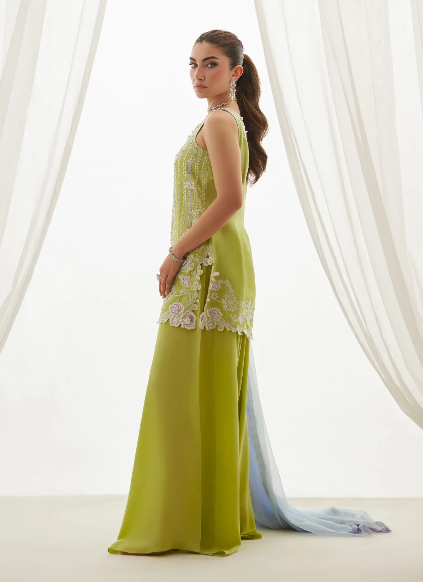 A zingy lime green ensemble that blends tradition with contemporary cool — a richly embroidered shirt, cut from pure raw silk, paired with fluid draped pants and a soft chiffon dupatta edged in lace. Effortless, chic, and made for every celebration.