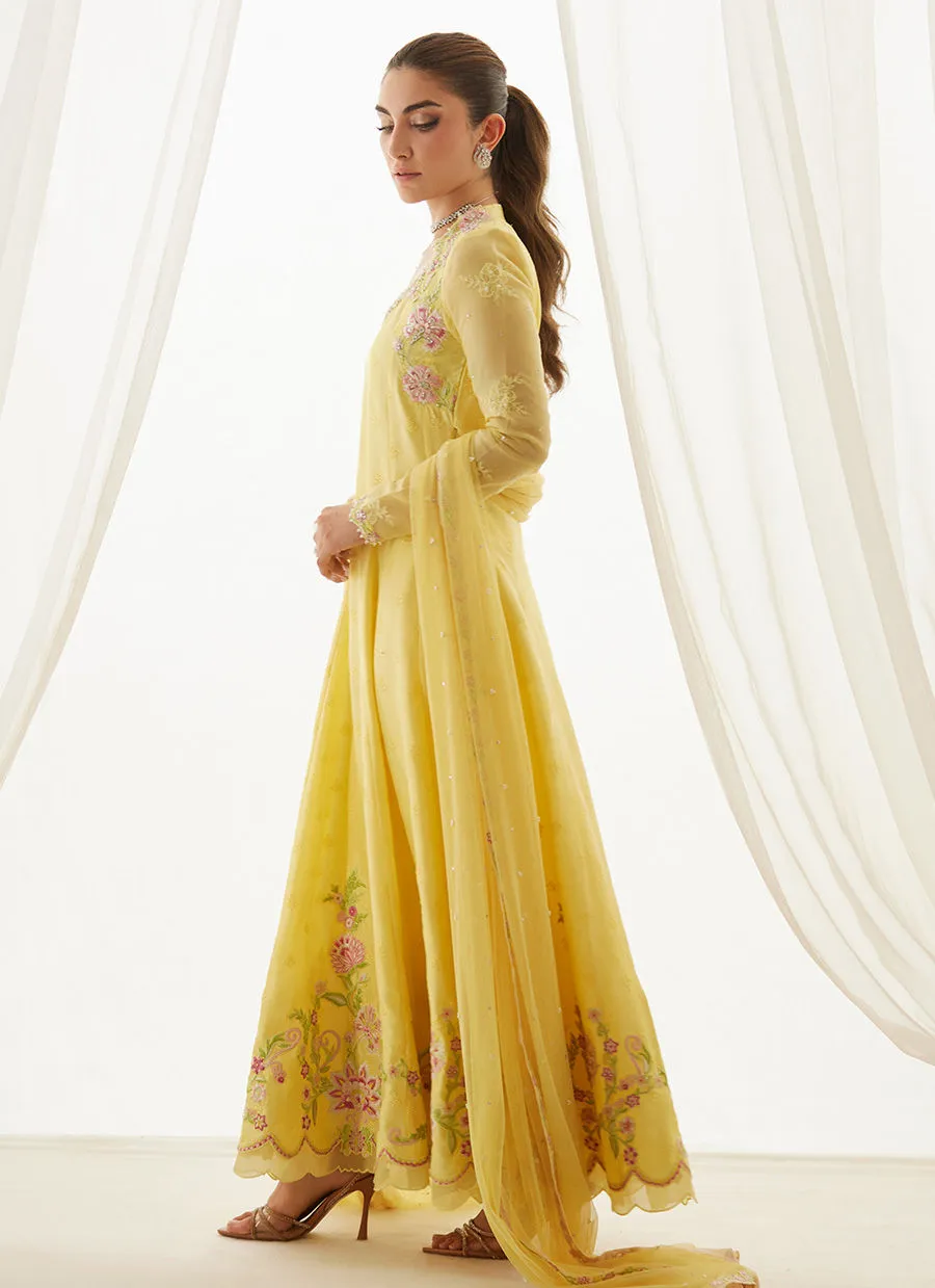Butter-yellow elegance, redefined. Cut from pure raw silk, this kalidar features sheer organza sleeves and delicate hand embellishment with pearls and Swarovski crystals. The look is anchored with a structured izaar detailed at the hem and completed with a diaphanous pearl-strewn dupatta. A refined yet statement-making choice for wedding season.