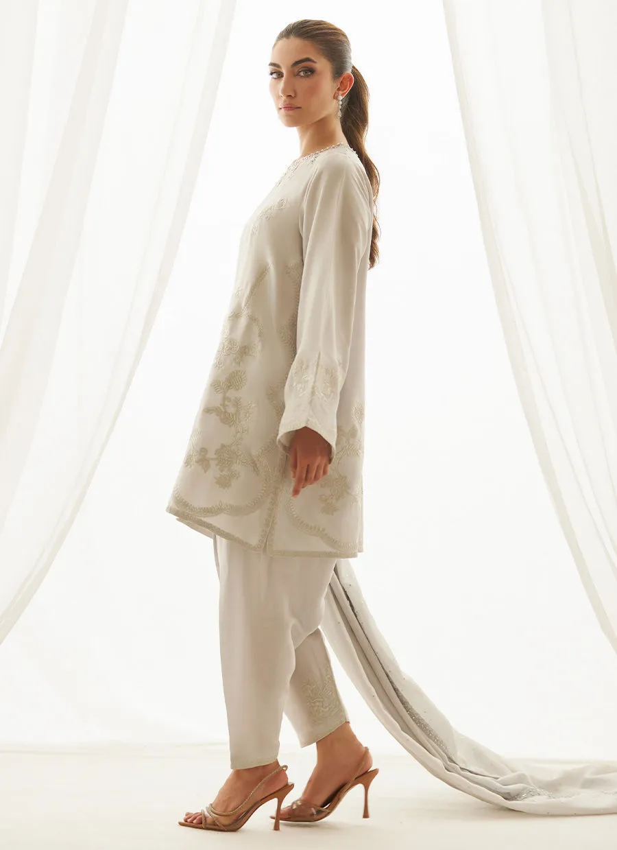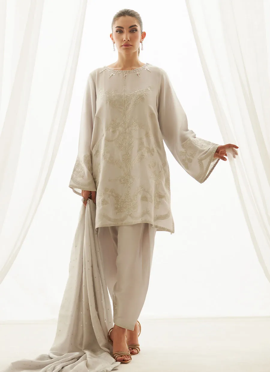 Refined yet striking — a silver grey raw silk shirt, intricately hand-embellished with mukesh at the neckline, pairs with a tailored shalwar accented by delicate embroidery. A pure medium silk dupatta, scattered with subtly shimmering sequins, completes the look with quiet glamour.
