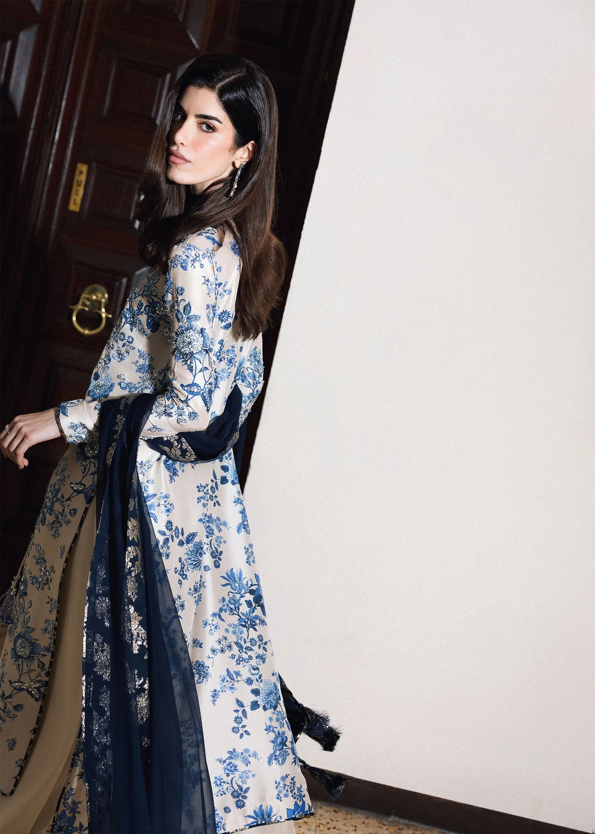 This elegant ensemble features a classic ivory and navy blue color palette, combining intricate floral patterns with modern tailoring. The long, straight-cut kameez is crafted from a lustrous ivory silk-blend fabric, entirely covered in an intricate blue floral print reminiscent of traditional porcelain. The neckline is designed with a small split-round opening, accented by long, thin drawstrings that terminate in decorative navy tassels. For the bottoms, the shirt is paired with voluminous, wide-leg palazzo trousers in a solid ivory silk that provides a clean, fluid contrast to the busy print of the top. A deep navy sheer dupatta, likely made of chiffon or organza, is draped over the shoulder and features matching blue and silver facing along its borders.