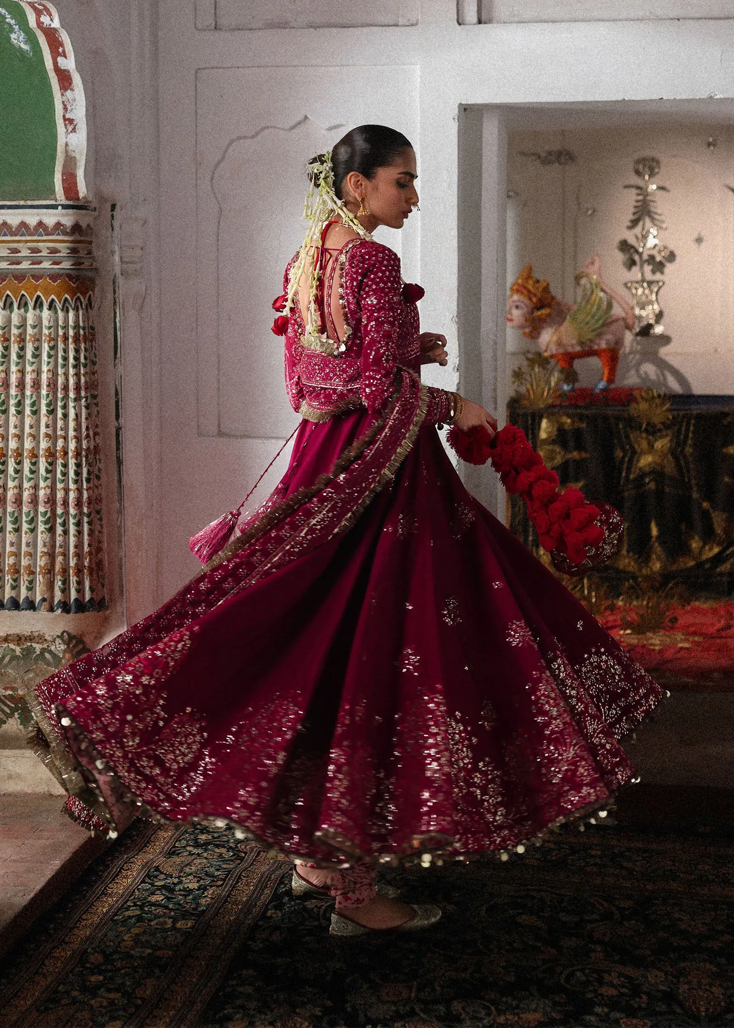 embroidered sleeve borders.The korean raw silk printed chooridar complete the look.The chiffon embroidered dupatta with four sided embroidered borders and embroidered jaal all over dupatta adds to its richness,while delicate embroidery enhance outfit festive charm.This dress is the true epitome of elegance and grace.