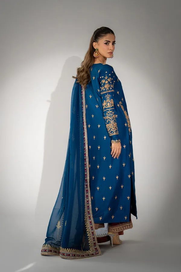 Experience true festive luxury in this deeply rich teal blue raw silk ensemble, a statement piece that perfectly balances tradition and grandeur. The long kurta is lavishly adorned with elaborate antique gold zari embroidery along the neckline and scattered gold motifs across the body, creating an opulent texture. This stunning look is completed with a coordinating, flowing dupatta featuring a heavily embellished border with rich maroon and gold detailing, making it ideal for high-end wedding festivities.
