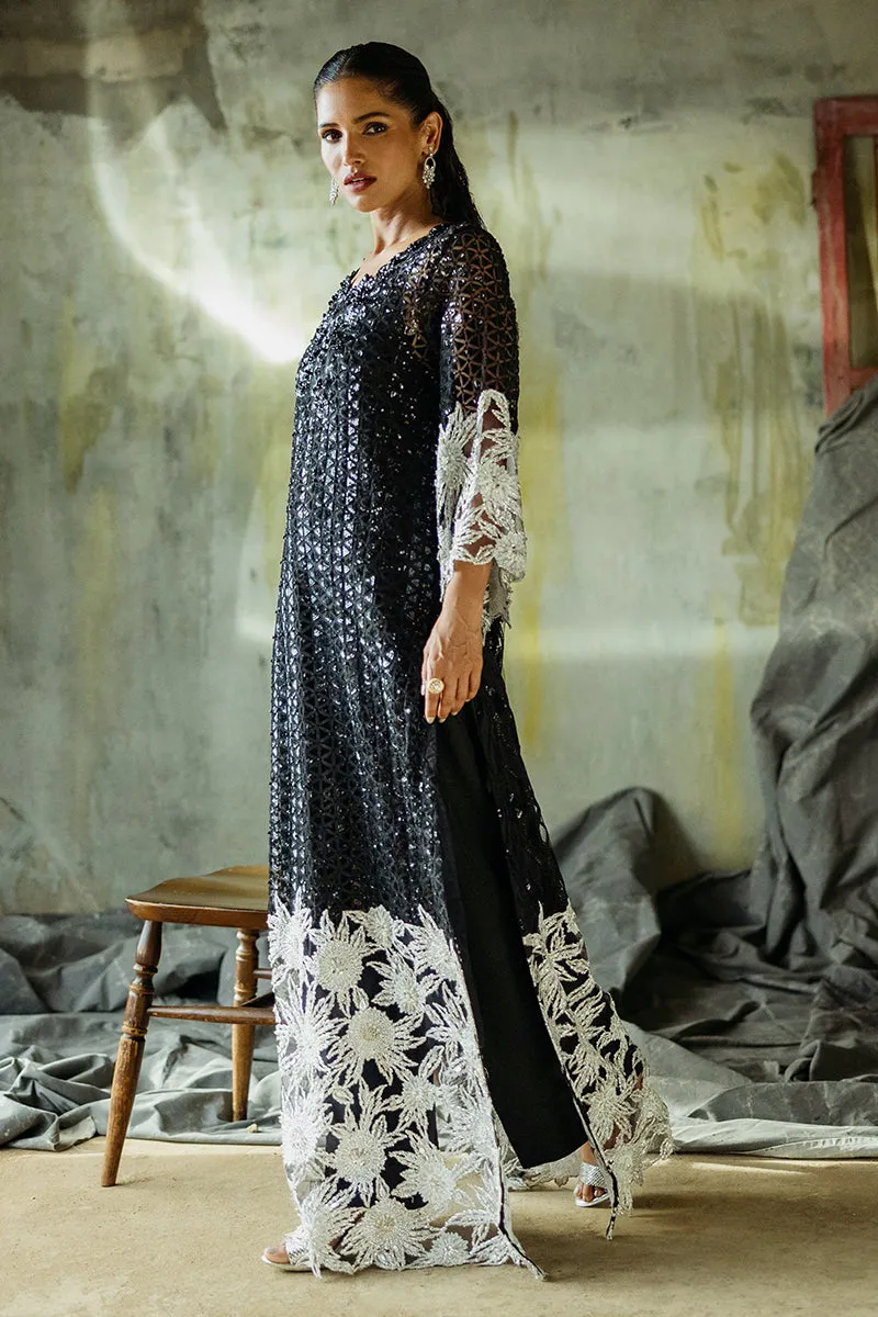 A stunning blend of elegance and sophistication, featuring an embroidered net shirt paired with luxurious raw silk trousers. The look is completed with an ethereal organza dupatta for timeless elegance.