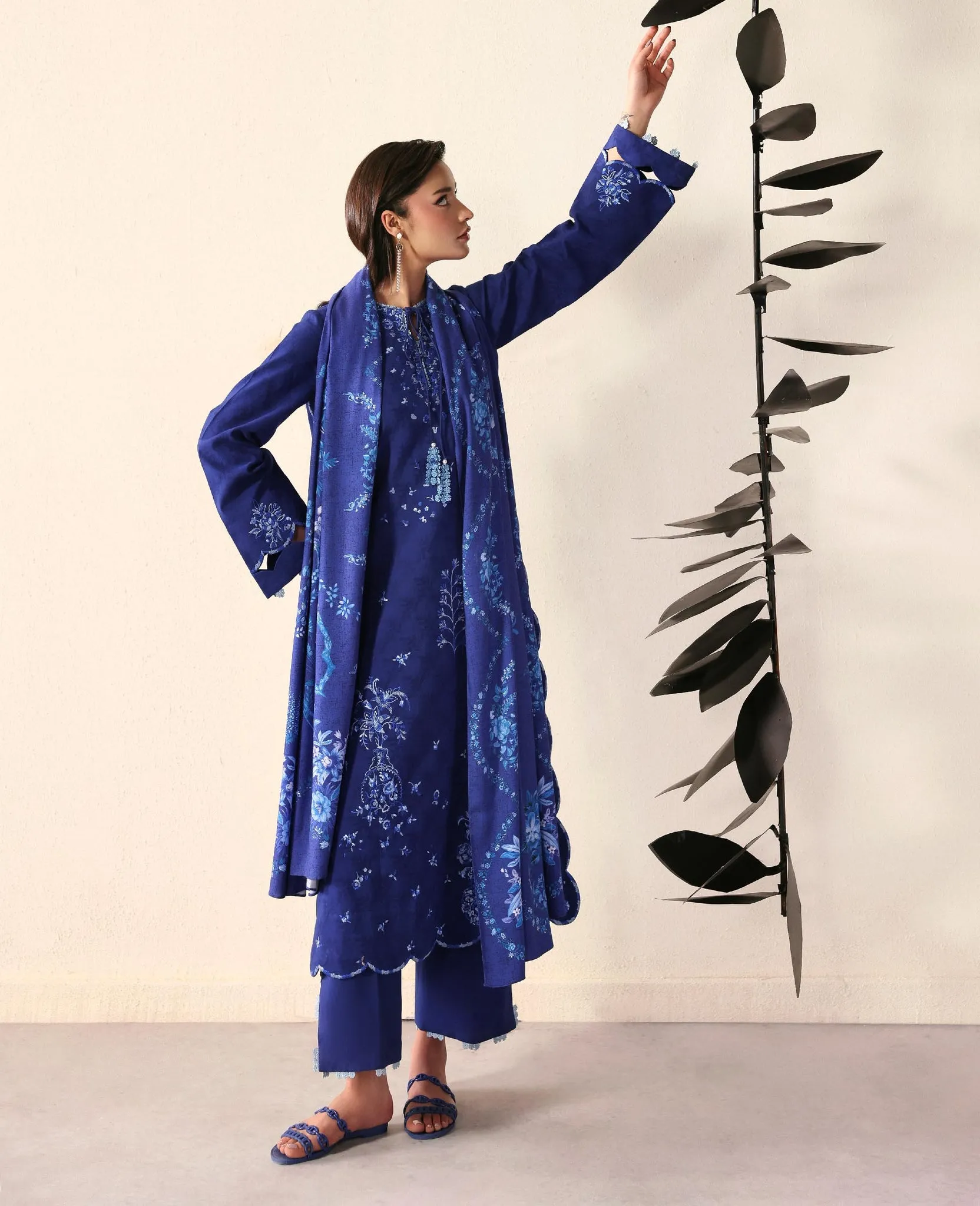 Long-length royal blue shirt with monotone embroidery inspired by Tatami stitch, covering the shirt all over. Embroidered sleeve borders and neckline add a touch of elegance. Paired with a printed Twill Marina shawl.