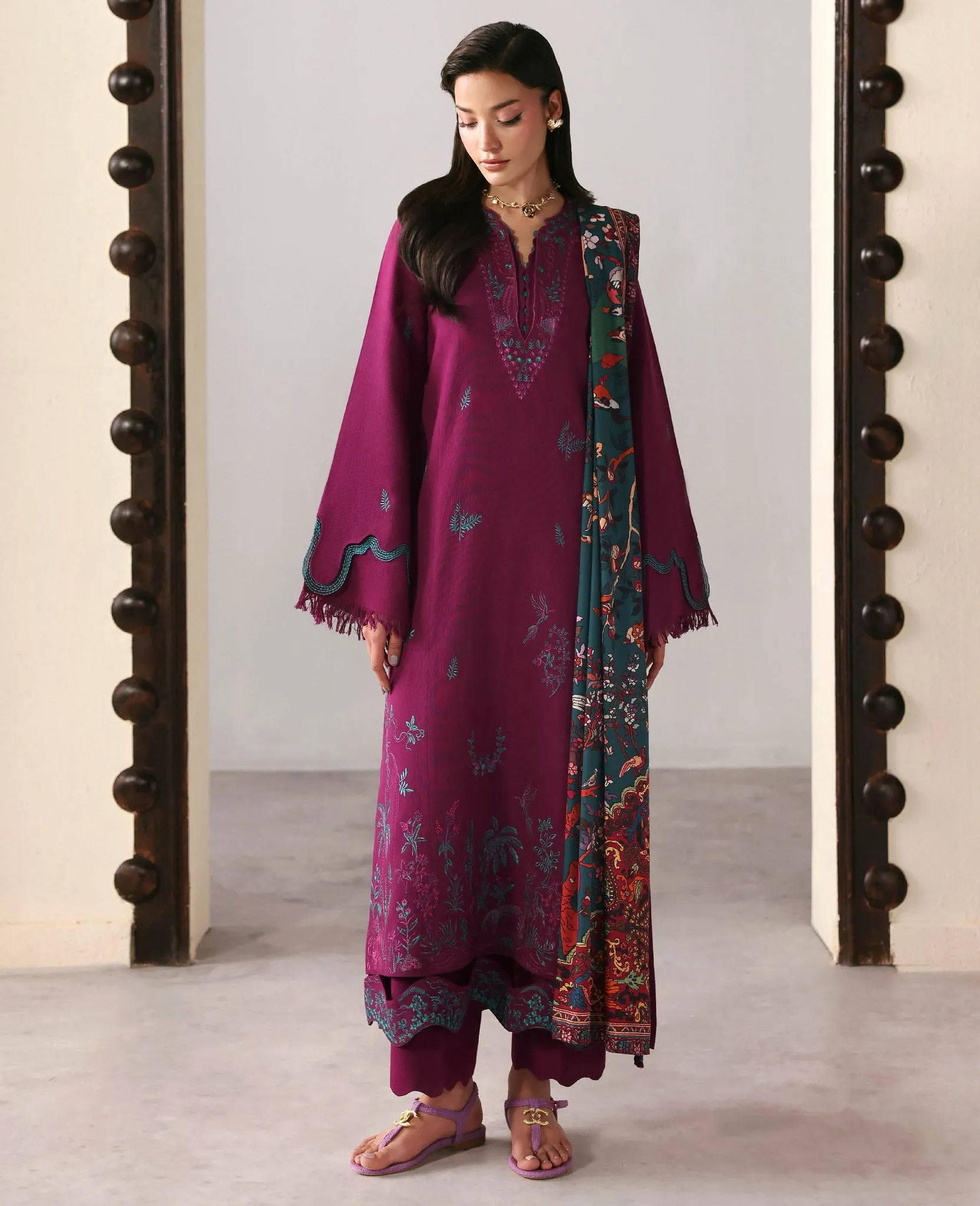 Wrapped in winter elegance: a long plum khaddar shirt adorned with Shikargah-inspired embroidery in striking teal, paired with chic culottes for a modern, effortless silhouette. Finished with a contrasting teal Twill Marina shawl, this ensemble blends heritage weaves with contemporary charm, quietly luxurious, beautifully detailed, and made to stand out.