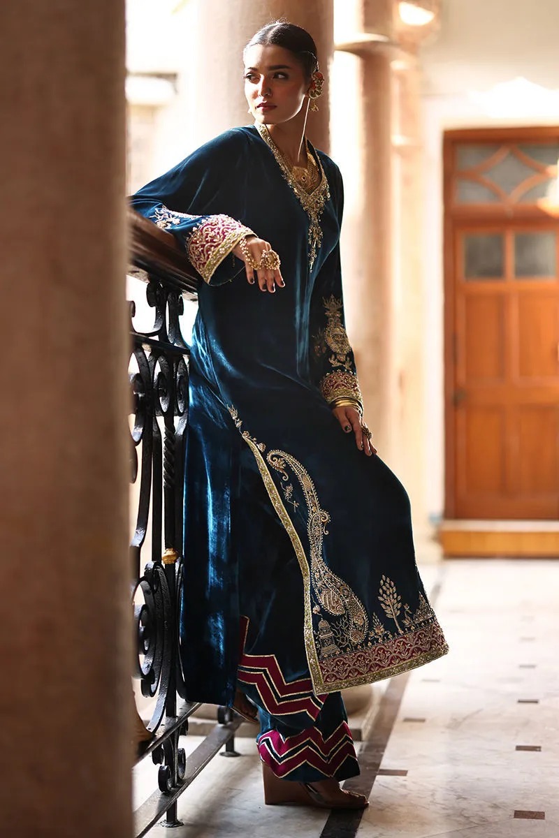 A loose-cut pure velvet shirt with pockets, beautifully rendered in a timeless Antique tone. The shirt is adorned with intricate appliqués, detailed gold embroidery, and heavy zardozi work featuring gota, dabka, nakshi, pearls, crystals, stones, cutdana, sequins, moti, and kaamdani on the front and sleeves. It is paired with pure velvet culottes and a lame chiffon dupatta, finished with delicate lace and banarsi detailing — a perfect balance of heritage artistry and contemporary grace.