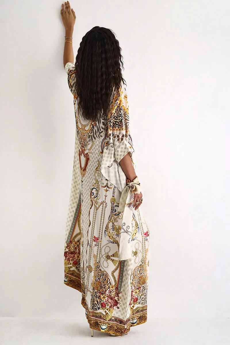 A statement silhouette brought to life with digital print and embellishment of imported colored stones, textured stones, cutdana, metals, crystals, sequins, and 3D flowers. Each element is thoughtfully placed to create depth, dimension, and a refined festive finish.