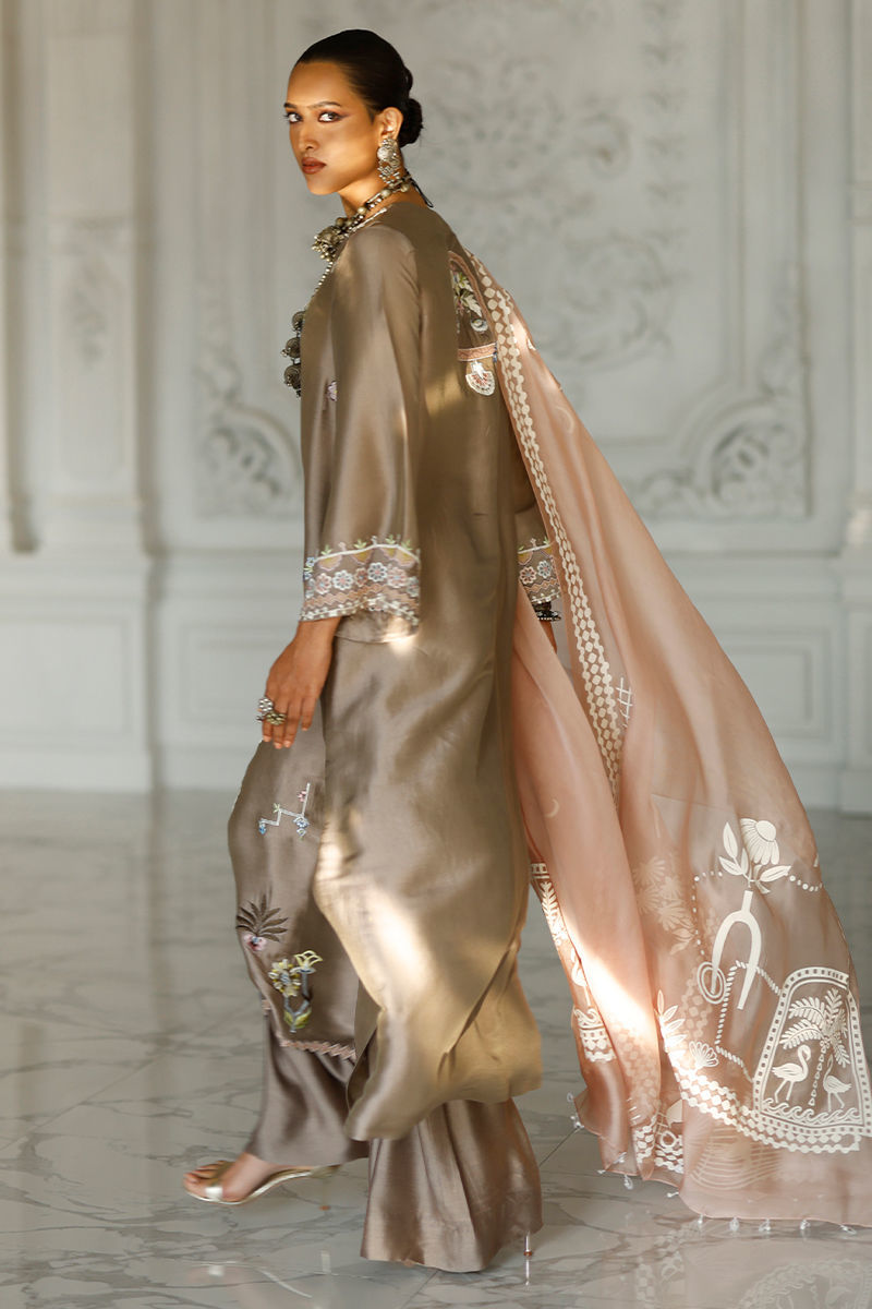 The caribou long shirt, crafted from butter silk, features refined appliqué work and intricate coloured resham embroidery across the front, back, and sleeves, finished with functional pockets. It is paired with pure cotton silk culottes for a fluid, elegant silhouette. The ensemble is completed with an adobe rose shisha organza dupatta, adorned with screen print and finished with handmade tassels, adding a graceful, artisanal touch.