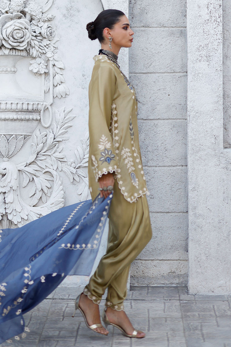 The yogurt tint loose-cut short shirt, crafted from butter silk, features pockets and is adorned with screen print, coloured resham embroidery, and delicate hangings across the front, back, and sleeves. It is paired with yogurt tint khari shalwar in cotton charmeuse, detailed with screen print on the bottom. The look is completed with a moon rock shisha organza dupatta, adorned with screen print and finished with handmade tassels, adding a refined and artisanal touch.