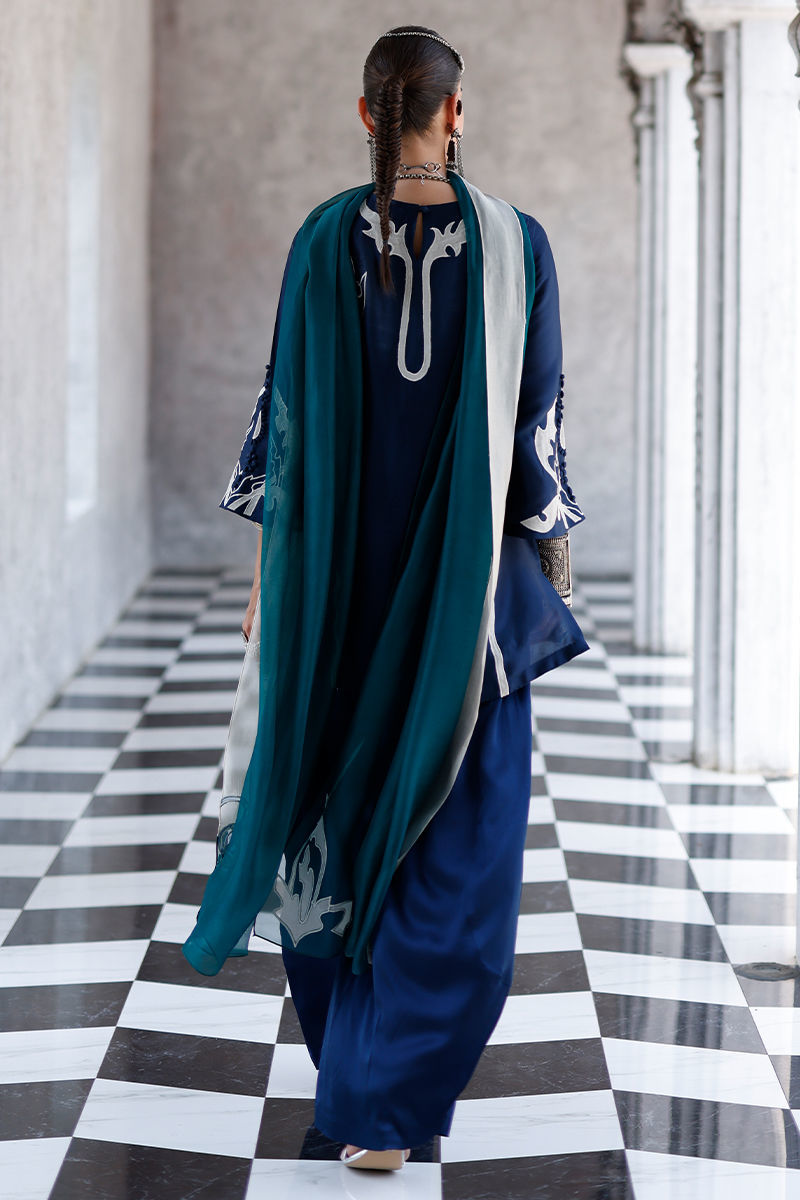 The deep blue short shirt, crafted from butter silk, features intricate self 3D detailing with appliqué work and resham embroidery across the front, back, and sleeves, creating a richly textured and refined look. It is paired with fluid cotton charmeuse balloon pants for effortless elegance, and completed with a sea green shisha organza dupatta adorned with appliqué work and resham embroidery, adding a graceful and elevated finish.