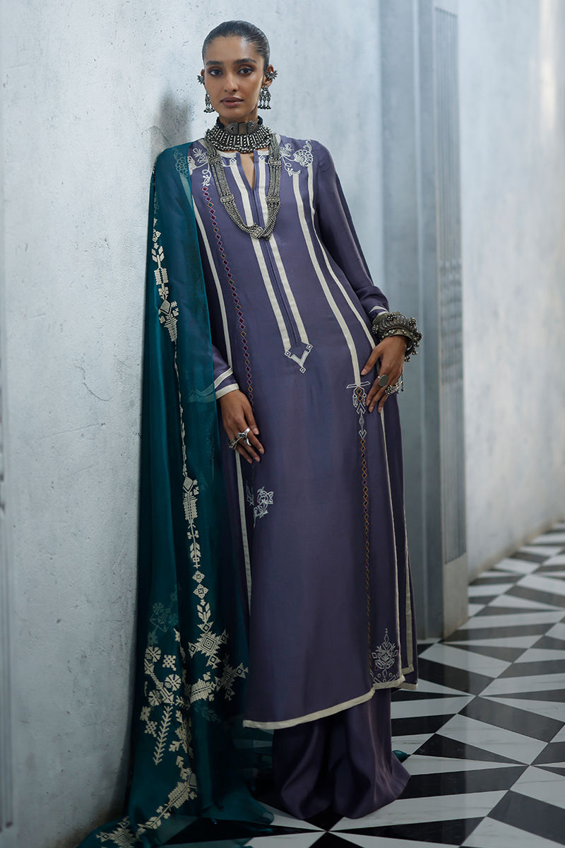 The grape jam panel shirt, crafted from butter silk, features intricate appliqué work and coloured resham embroidery across the front, back, and sleeves, creating a refined, artisanal finish. It is paired with pure cotton silk culottes for a fluid and elegant silhouette. The ensemble is completed with an antique green shisha net dupatta, detailed with screen print and finished with handmade tassels, adding a graceful and elevated touch.