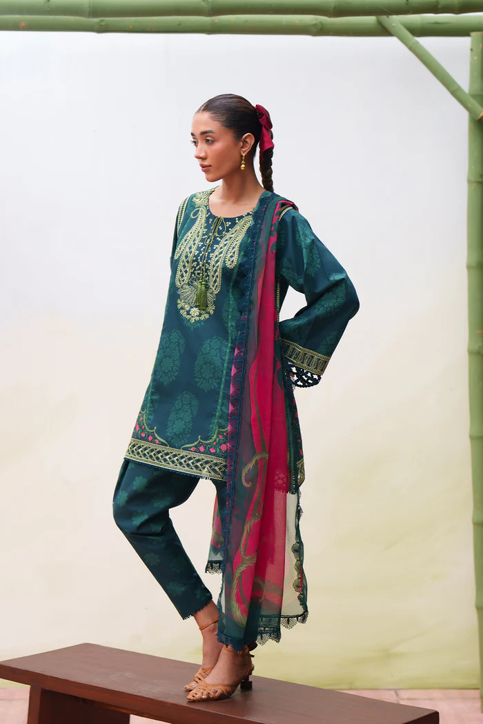 DESCRIPTION: This beautiful 3-piece unstitched lawn outfit features intricate detailing and is gracefully paired with a soft, flowy chiffon dupatta.