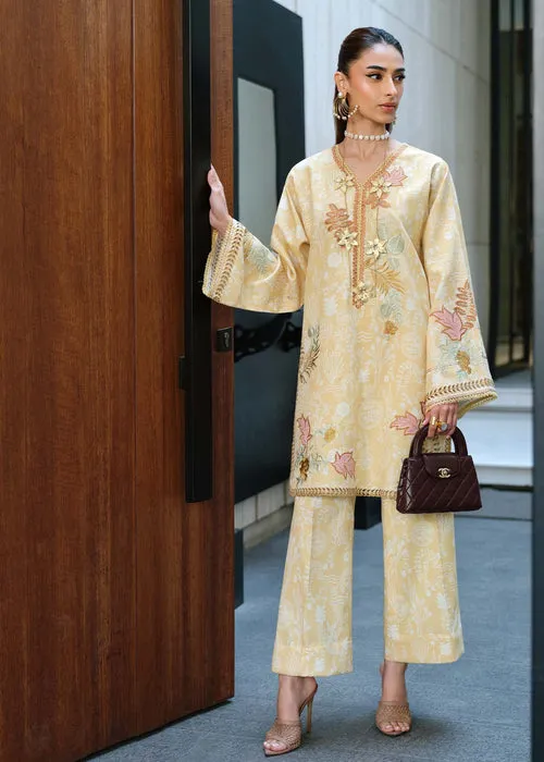 A radiant yellow khaddar design with beautiful embroidery detailing along the neckline and shirt front, finished with delicate accents to balance the brightness with elegance. A cheerful winter pret outfit with a luxe traditional touch.