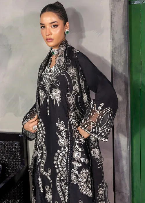 This ritzy frosted ebony silk gracefully envelops the silhouette. It’s ethereal fabric adorned with sparkling mirror work and intricate Ivory embroidery dance in a mesmerizing display of opulence. this masterpiece embodies timeless elegance-perfect for the woman who commands the spotlight with effortless sophistication.