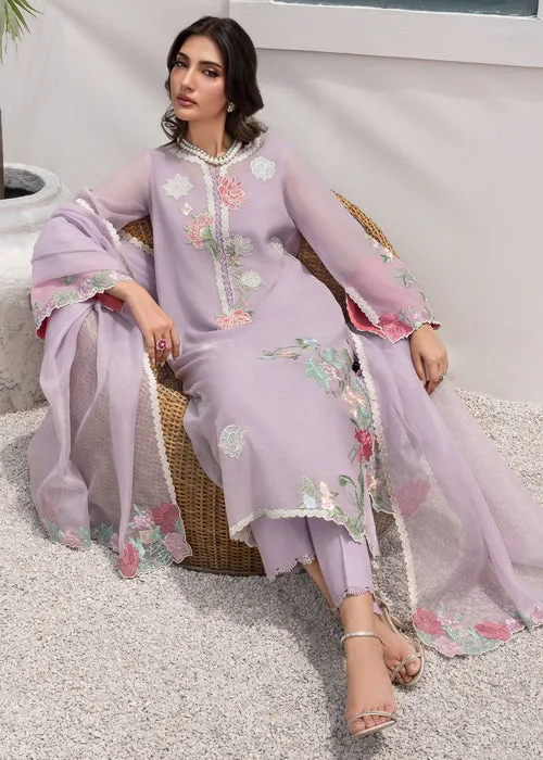 Additional Description: The Poem of Lavender. A celebration of soft romance , Irisé is a design that evokes the delicate poetry of lavender kissed sky. Embroidered in ghara technique in soft blue hue, and appliquéd in bright coral lilies this ensemble radiates elegance and grace. The sleeves, adorned with with cut our embroidery and a contrasting coral finish, offer a gentle pop of color. . The airy cotton net dupatta, has embroidered cutout corners on all four side and ivory borders finishing the lengths. The soft, romantic embroidery enhances this ensembles inherent grace. Shirt Length 49 Pants Length 37 Fabric Details: Shirt: Khaadi Cotton Pants: Cotton Silk Dupatta: Cotton Net Slip: Cotton Silk