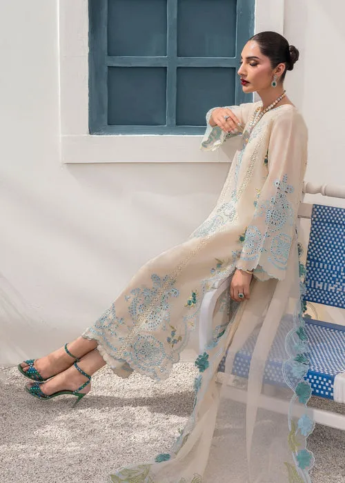 Additional Description: Delicate and enchanting, Serra captures the essence of soft nude beige hue in its purest form. Intricate lacework and cutwork embroidery on the front panel in the softest shade of powder blue create a masterpiece, with scalloped edges and floral motifs in aqua and teal shades add a refined touch of grace. Paired with a cotton silk pant featuring subtle detailing, of cutwork on the hem. Serra strikes the perfect balance between sophistication and ease. A cotton net dupatta, adorned with a scalloped floral border, and cutout floral pallus completes the look. Serra is timeless and graceful. Shirt Length 48 Pants Length 37 Fabric Details: Shirt: Khaadi Cotton Pants: Cotton Silk Dupatta: Cotton Net Slip: Cotton Silk