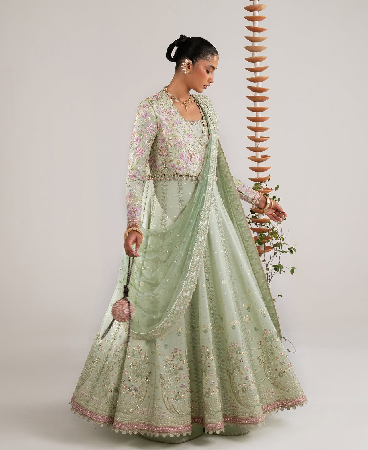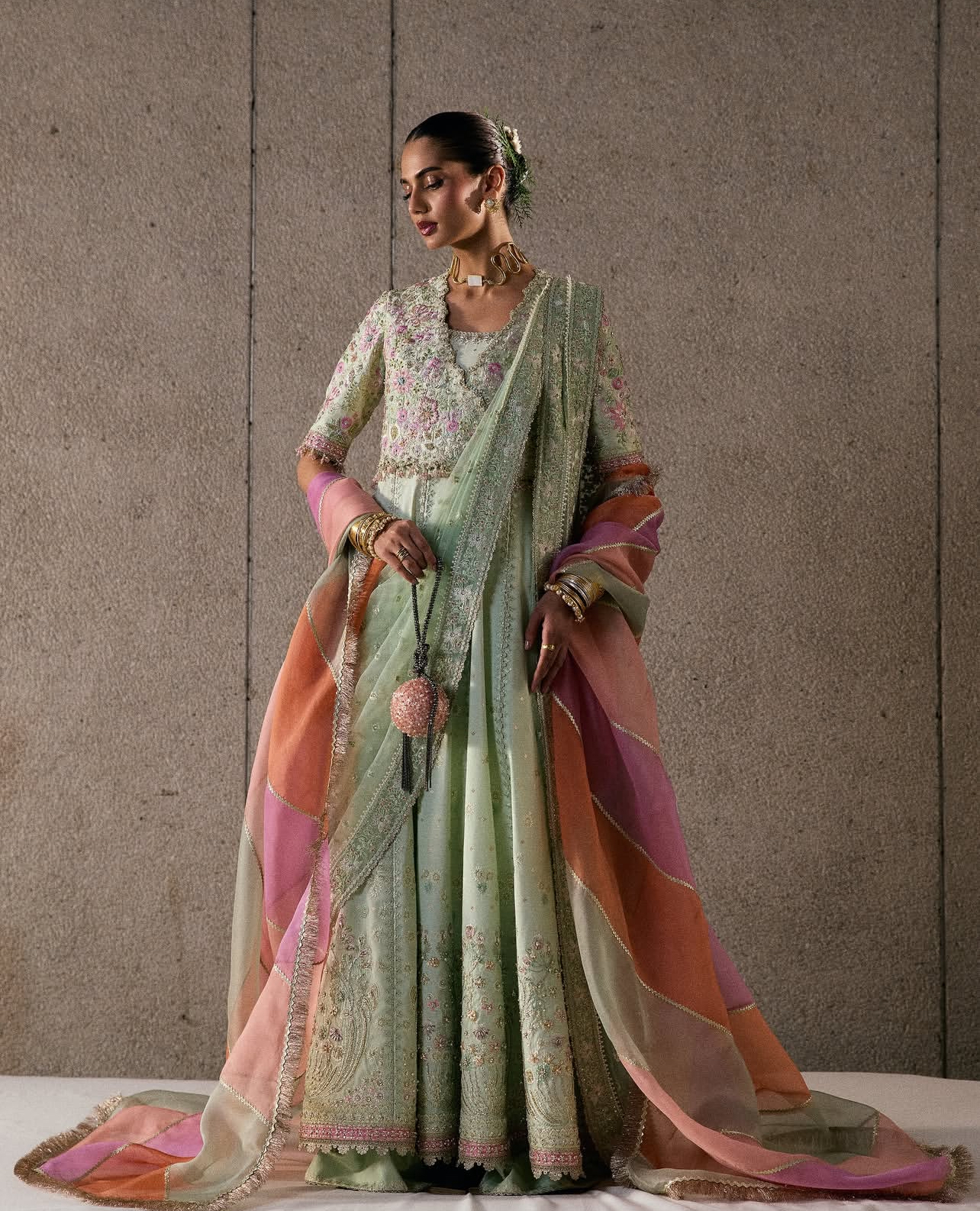 In refreshing icy mint, this six-piece look features a jacquard silk pishwas with a scoop neckline, hot pink contrast borders, and lace-lined panels. Sleeve options include half or full, both embroidered and finished with tassels. A raw silk coatee wraps over the pishwas, fully embroidered with multicolored handwork, scalloped edges, and tassel detailing. Paired with matching loose raw silk pants and a printed slip. The double-drape net dupatta is finished with embroidered borders and a soft mesh spray, offering versatile styling.