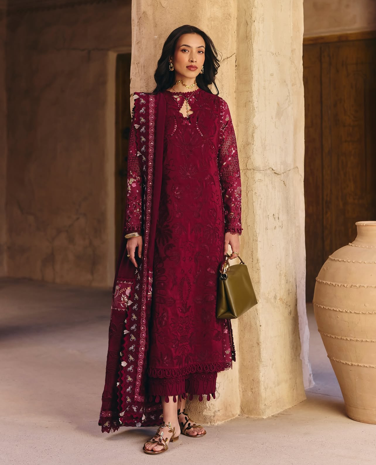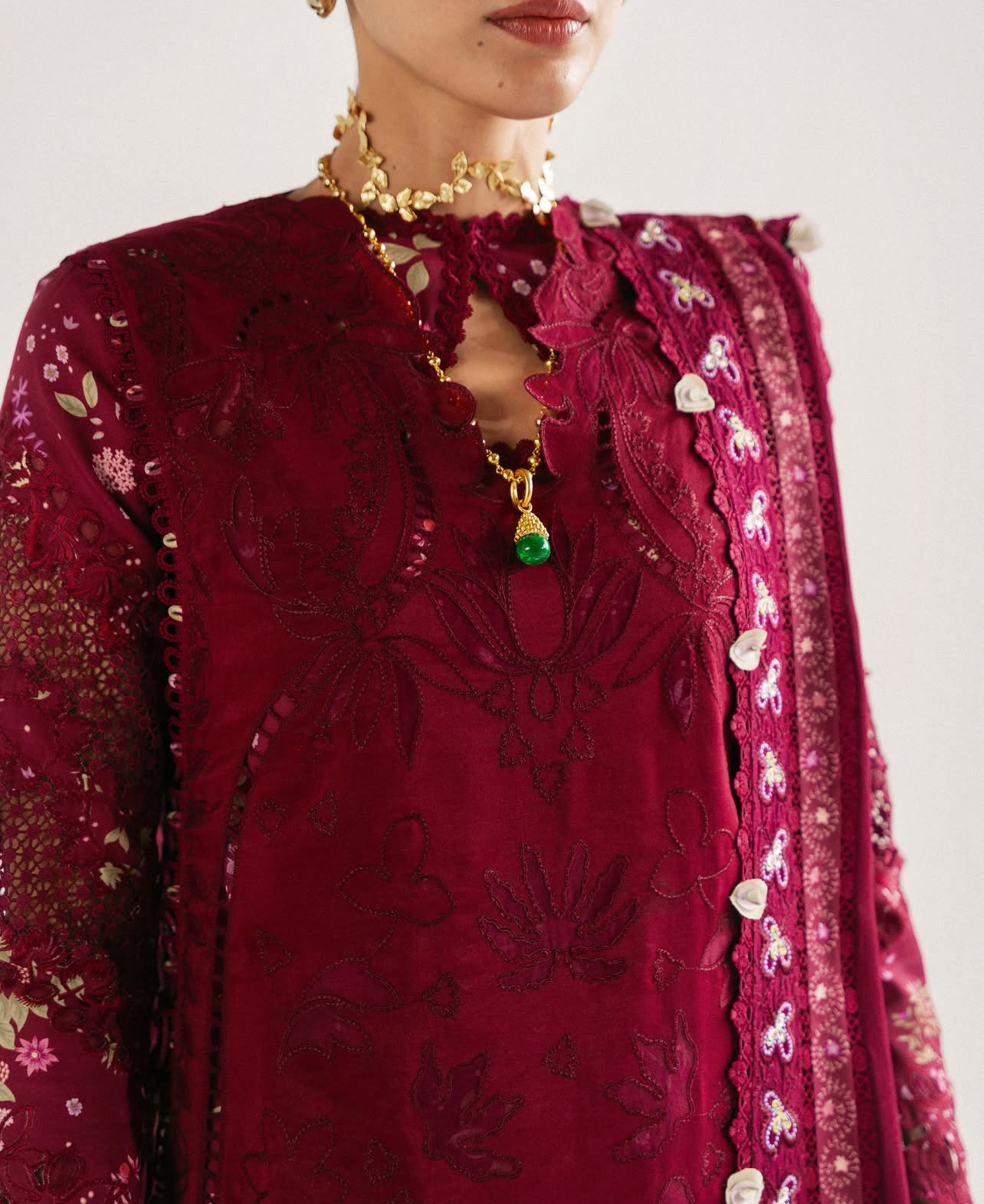 Step into spring and summer’s light with this 4-piece Maroon ensemble, a vision of renewal for Eid. The double-layered kurta boasts intricate cutwork and embroidery over a printed lawn inner, paired beautifully with maroon lawn cullottes and a detailed chiffon dupatta, offering variance in texture and design.