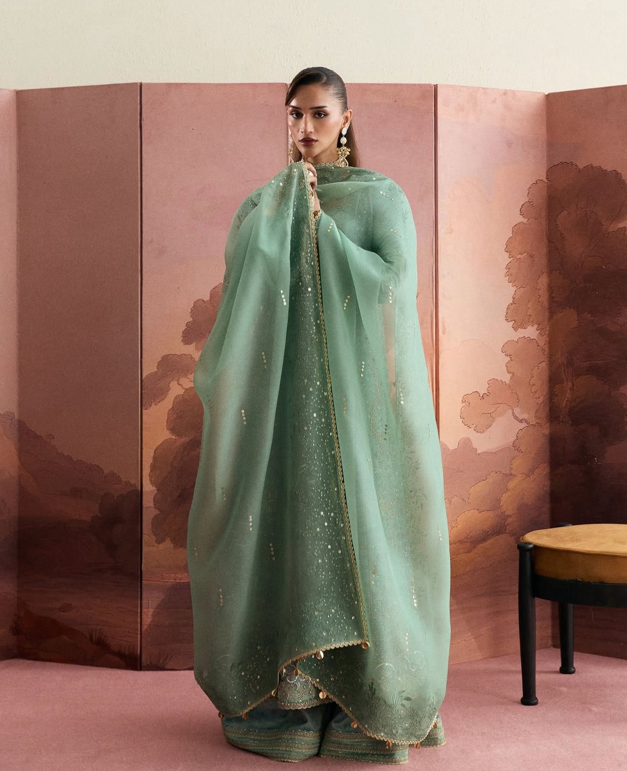 An exquisite 3-piece ensemble in Sage Green embodies renewal and variance. The Sage green printed velvet half overlapped angrakha shirt, featuring fitted sleeves, presents an embellished story in embroidery and glimmers, accented by gold lace panels and a geometrically consistent hem decorated with forest-like leaves and petals. Paired with sage green printed velvet aazar pants finished with layered lace borders, and completed by a sage green organza dupatta detailed with four-sided minimal leaf embroidery, perpendicular sequin lines, and a lace finish. This look offers unparalleled class and thoughtful detail.