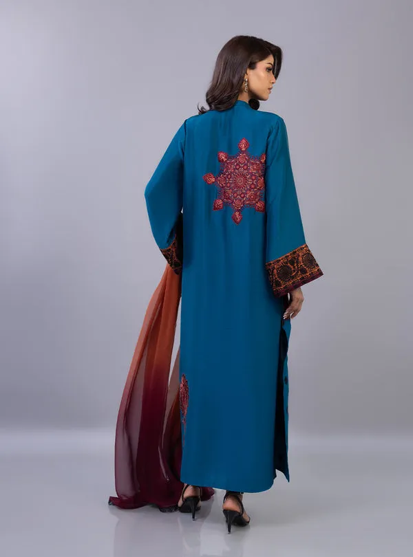 Capture the essence of artisanal beauty in this striking teal ensemble, where traditional Suzani craft meets a vibrant, modern palette. The long shirt is intricately detailed with all-over black motifs and bold, rust-toned medallions that anchor the hem and the wide, statement cuffs. A sophisticated band collar adds a refined structure to the silhouette, while the dual-toned rust dupatta provides a warm, glowing contrast to the cool peacock blue base. This masterpiece of color and craft is the ultimate choice for a standout Eid look.