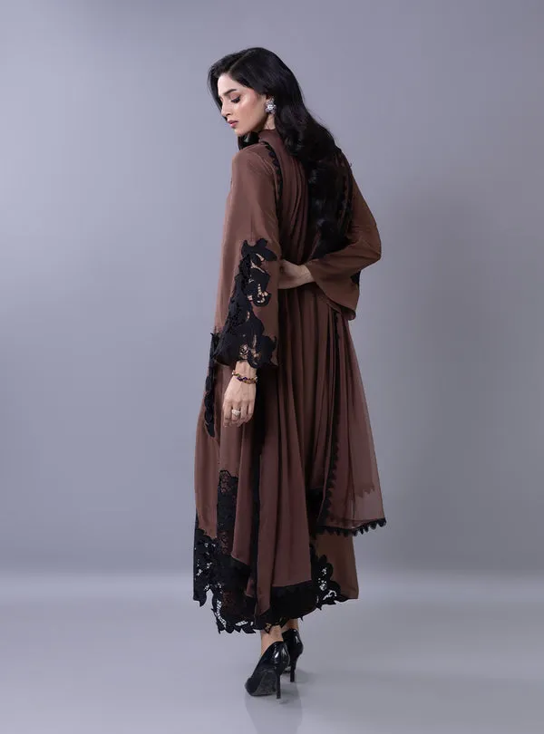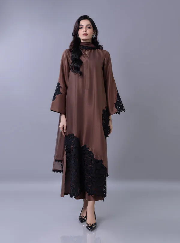Elevate your festive look with this mocha-brown ensemble, a stunning blend of modern minimalism and bold detailing. The sleek shirt features a sophisticated band collar and hidden placket, providing a clean canvas for the dramatic black floral lace applique cascading across the hem and sleeves. Paired with a matching dupatta adorned with a delicate lace, this outfit offers a refined balance of traditional modesty and contemporary flair, making it an essential choice for your Ramadan and Eid festivities.