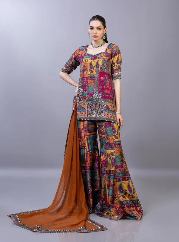 The outfit features a contemporary short-length shirt that offers a crisp and tailored look, perfectly balanced by dramatic flared trousers that add movement and flair to every step. Drenched in a rich palette of deep indigos and teals, the set is adorned with an intricate fusion of geometric borders and traditional motifs. This effortless pairing of a structured cut with a bold print makes it an ideal choice for a high-fashion Eid look that is both comfortable and undeniably stylish.