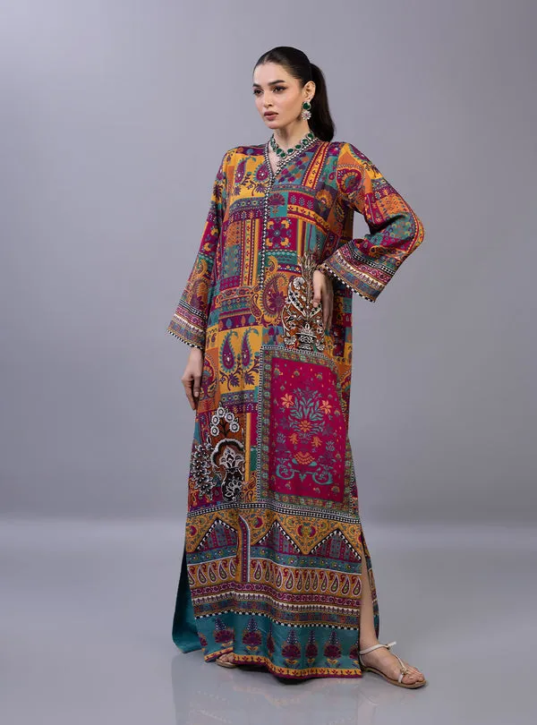 Step into a world of vibrant heritage with this stunning kaftan, a rich tapestry of traditional patterns, blending deep teal, mustard, and crimson into a striking visual narrative. This piece is elevated by striking ivory-white embroidered appliqués on the front and back, providing a sophisticated contrast to the rich teal, mustard, and crimson palette. Crafted for the bold and the elegant, its relaxed silhouette and wide structured sleeves make it a standout choice for high-fashion festive wear.
