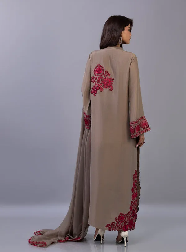 Exude an air of refined grace in this stunning taupe ensemble, a perfect fusion of muted elegance and fiery artisanal detail. The long shirt is meticulously crafted with a clean band collar and a hidden placket, serving as a sophisticated canvas for the bold, crimson-red embroidery that anchors the hem with majestic Suzani motifs. Intricate floral sprays adorn the shoulder and back, while the wide statement cuffs feature dense, traditional threadwork that adds a layer of heritage charm. Completed with a matching pants and a lightweight dupatta finished with a delicate red lace.