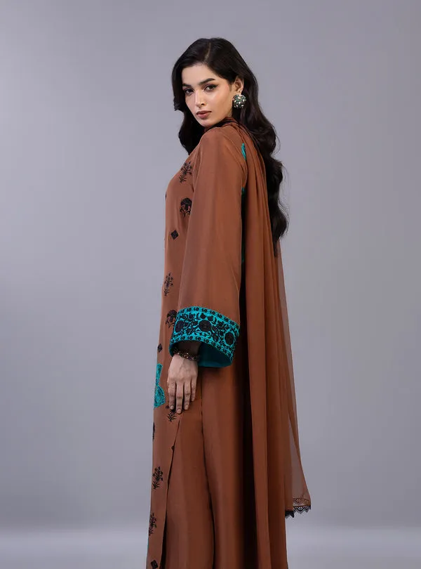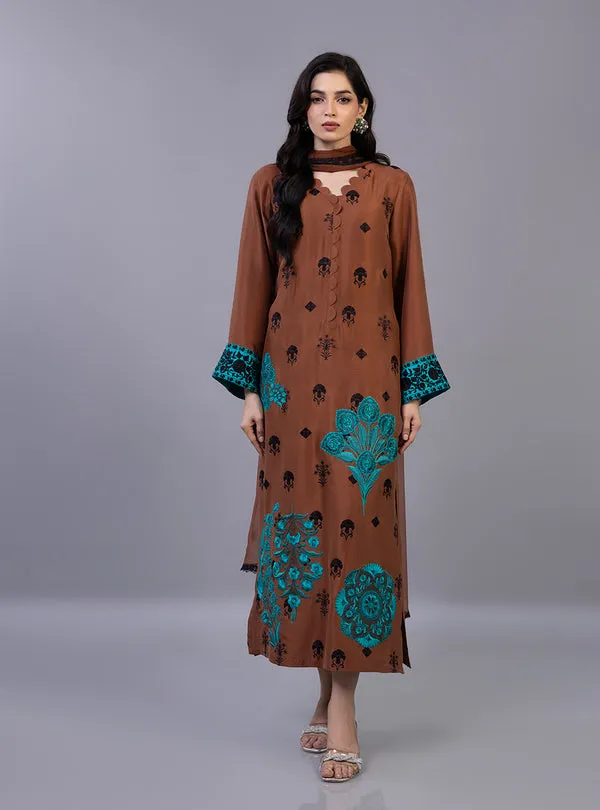 Make a vibrant statement this Eid in this terracotta ensemble, beautifully contrasted with striking turquoise Suzani-style embroidery. The shirt features a delicate scalloped neckline and intricate floral medallions that flow into wide, statement sleeves.