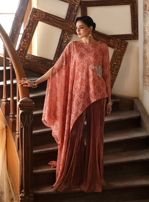 An outfit that makes you feel instantly light, confident, and utterly sophisticated. The top is cut in a fluid, cape silhouette from a delicate Blush-Toned Chantilly Lace which drapes beautifully and gives your movement an ethereal quality. This soft texture is elegantly grounded by a striking silver hand-embellished, placed to define your waist with a precious shimmer. Paired with perfectly tailored flared trousers in a rich, complementary rust tone.