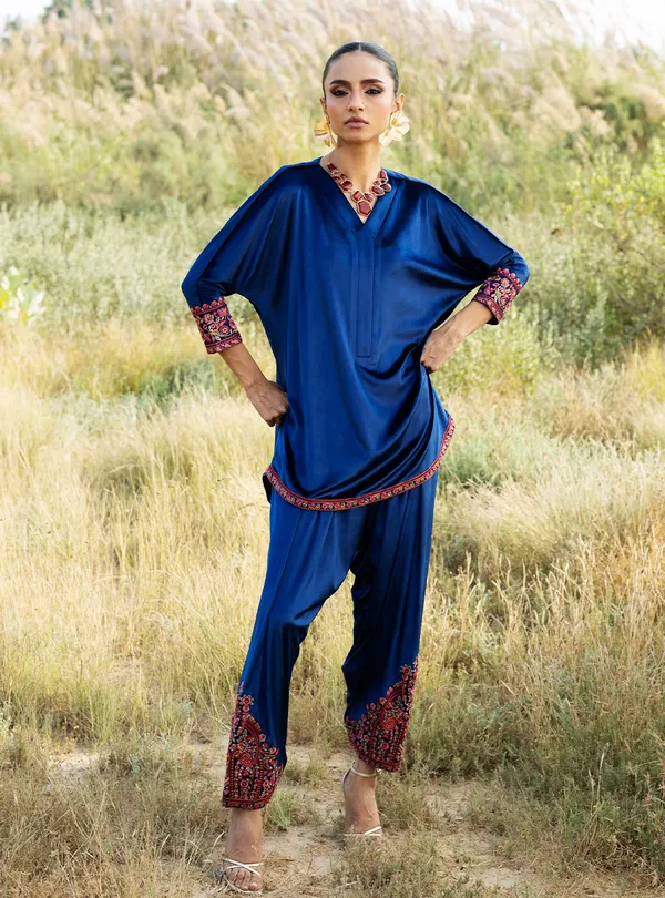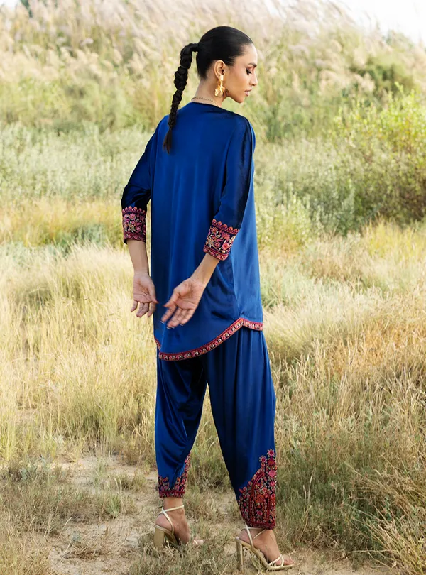 Meet your new obsession: The Boho Blues velvet set! This is pure Velvet Hour energy. Crafted in a breathtaking, deep cobalt blue, the fabric is plush, soft, and effortlessly drapes for that perfect, cozy fit. The short kurta features a simple neck placket, letting the rich color speak for itself. But the real moment? The shalwar bottoms feature vibrant, contrasting embroidery along the cuffs, it’s the perfect Stitch Play detail that takes this from simple to stunning.