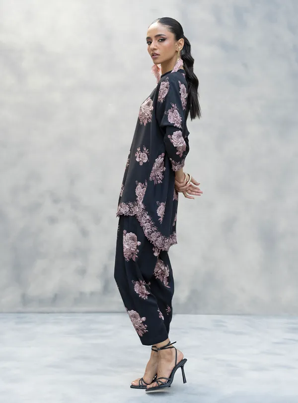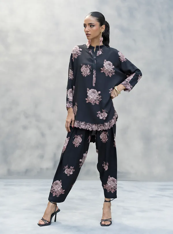 Okay, stop scrolling because you just found the fit. This black viscose set is serving major Moody Romance vibes. Covered in dreamy, dusty-pink florals, it’s the perfect blend of edgy and sweet. The relaxed-fit kurta and slouchy shalwar are ridiculously cozy, but that super cute scalloped border on the hem and cuffs? That’s the Elevated Flex that takes it to the next level. Pair it with heels for a dinner date or your favorite kicks for a chill day out either way, you’re giving!