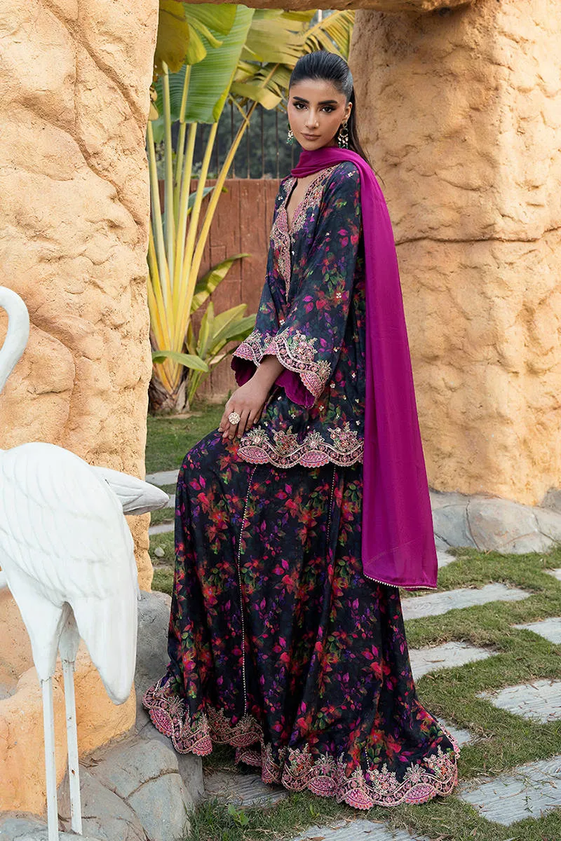 The digitally printed pure raw silk jacket is elevated with intricate hand embellishments and finely detailed embroidered borders along the neckline, sleeves, and hem, adding depth, texture, and a luxurious finish to the silhouette. Paired with the jacket are flowing digitally printed sharara pants in Korean raw silk, finished with embroidered borders that enhance their graceful movement. Completing the look is a rich KP silk dupatta, draped effortlessly to add a bold contrast and a refined touch of elegance.
