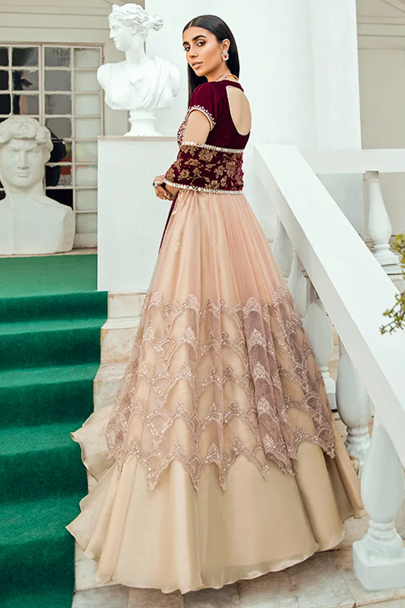 A heavily embellished maroon velvet choli with net kalidaar adorned with mirror work, gota, sequins and embroidery. It is paired with a floral foil screen printed stole with mirror finishing and a tissue skirt.